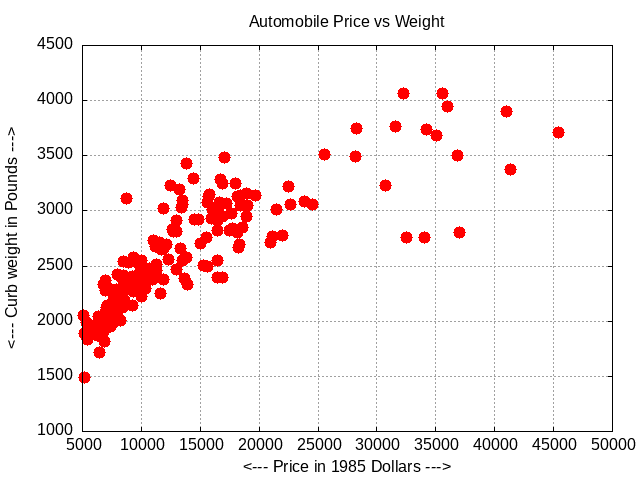 automobile_scatter contains prices and weights of cars available in 1985. A scatter plot is to be made. The gnuplot() program is used.