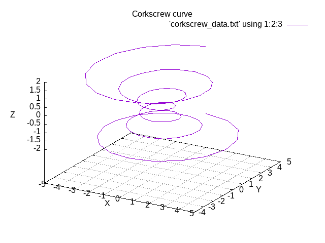 corkscrew_plot3d generates (X,Y,Z) points that lie along a 3D curve looking something like a corkscrew. The gnuplot() program is used.