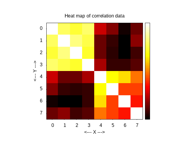 correlation_heat_map takes an 8x8 correlation matrix and draws an 8x8 grid of squares, colored white for the highest values, yellow, then red, and black for the lowest.