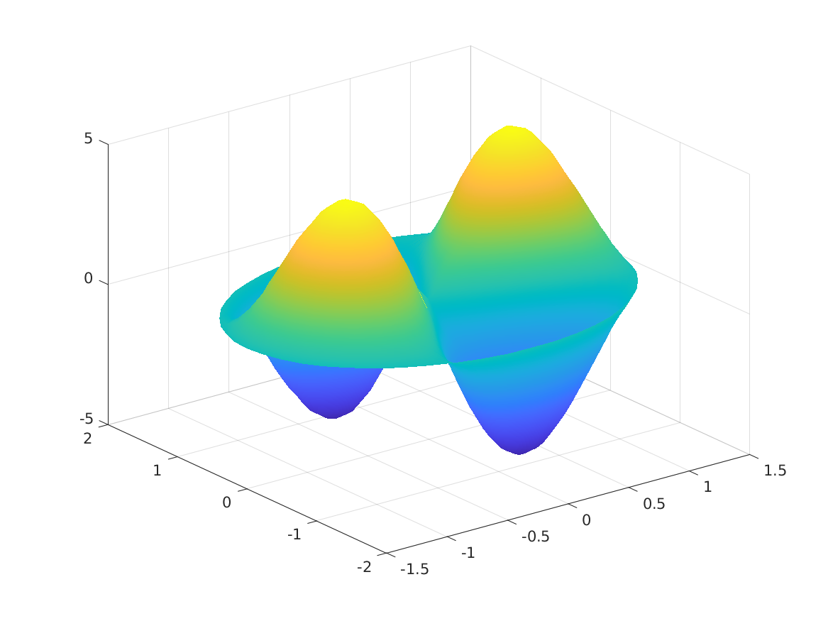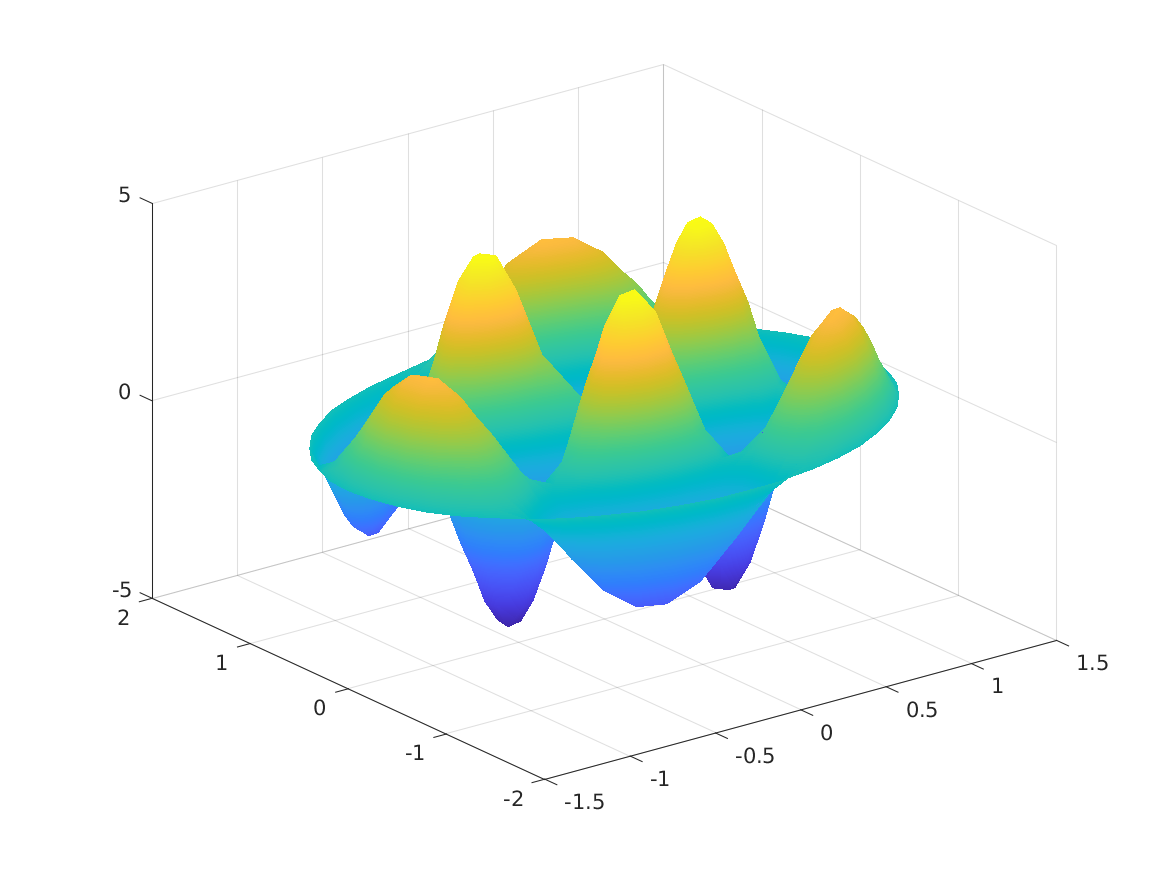 helmholtz_exact, a MATLAB code which evaluates an exact formula for the solution of the Helmholtz equation, a sort of eigenvalue equation that can arise after separation of variables is a applied to the wave equation. This example considers a problem in which Z(x,y) represents the vertical deflection of the surface of a vibrating circular membrane such as a drumhead.