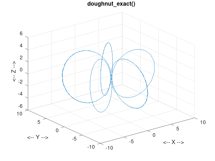 doughnut_exact, an Octave code which evaluates an exact solution of a system of ordinary differential equations (ODE) whose trajectories lie on a torus or doughnut, and for which an exact solution is known.
