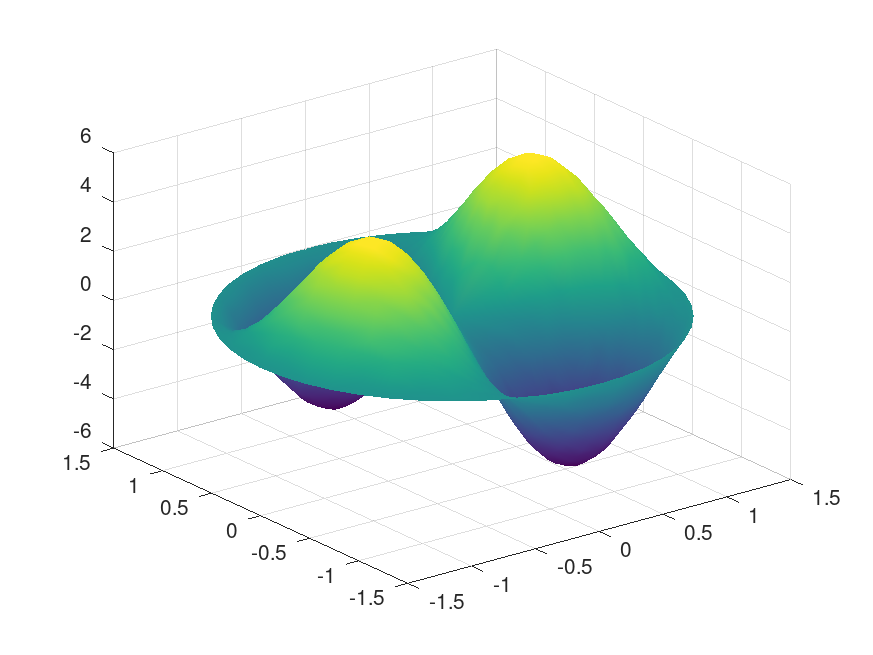 helmholtz_exact_test, an Octave code which calls helmholtz_exact(), which evaluates an exact formula for the solution of the Helmholtz equation, a sort of eigenvalue equation that can arise after separation of variables is a applied to the wave equation. This example considers a problem in which Z(x,y) represents the vertical deflection of the surface of a vibrating circular membrane such as a drumhead.