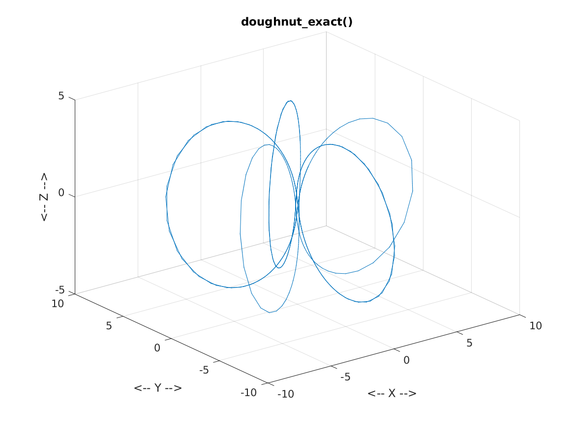 doughnut_exact, a MATLAB code which evaluates an exact solution of a system of ordinary differential equations (ODE) whose trajectories lie on a torus or doughnut, and for which an exact solution is known.