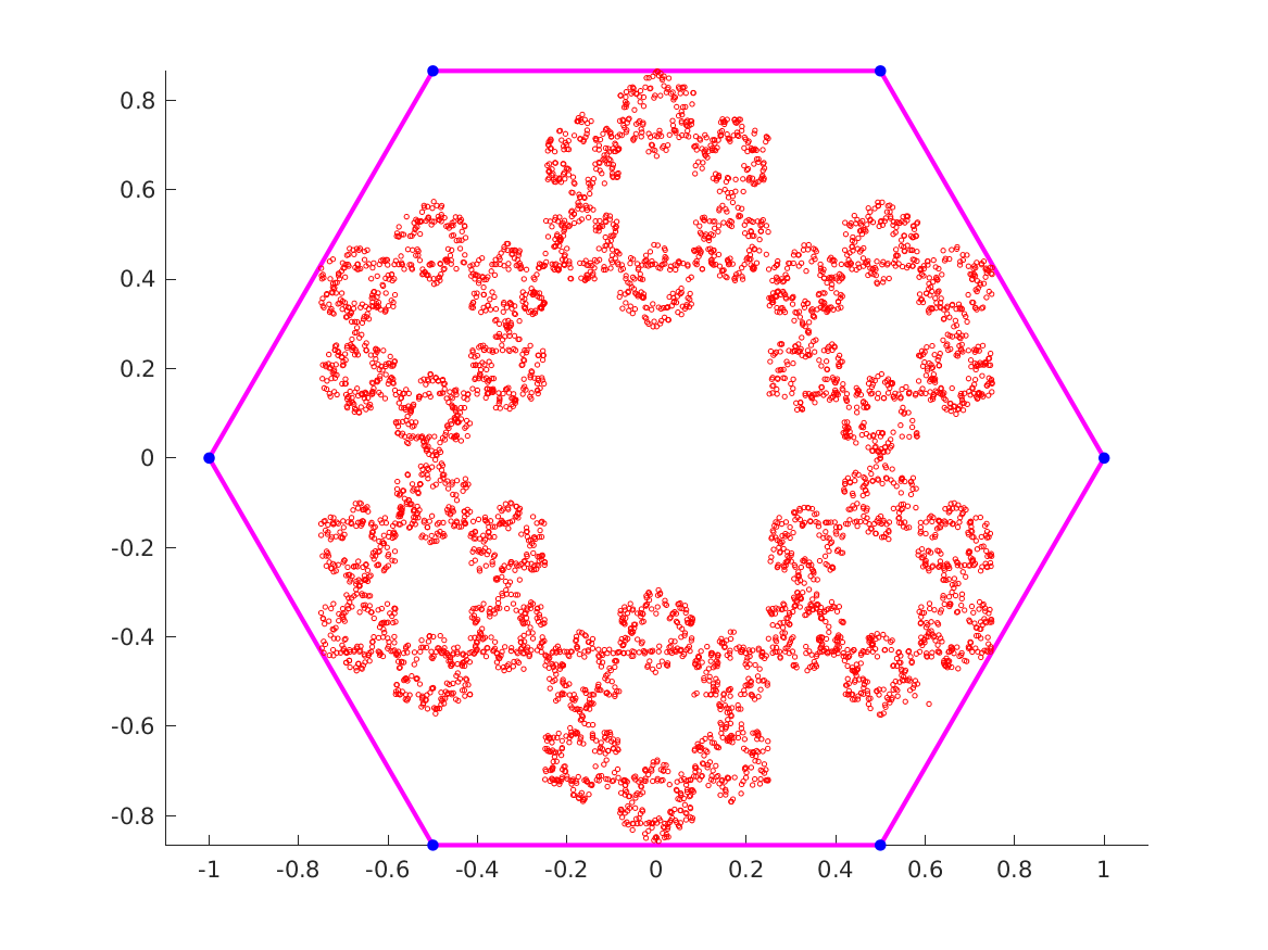 hexagon_chaos, a MATLAB code which produces a fractal image inside a hexagon by repeatedly computing the barycenter of the triangle formed by the iteration point and a randomly chosen side of the hexagon.