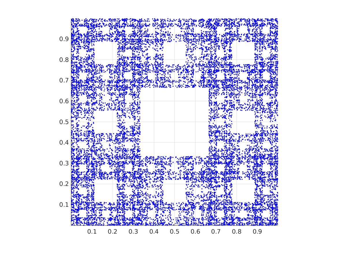 menger_sponge_chaos, a MATLAB code which applies a randomized linear map to a starting point to create a 3D dot-plot image of the Menger sponge.