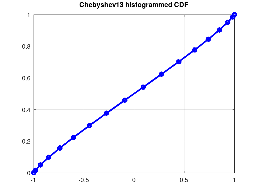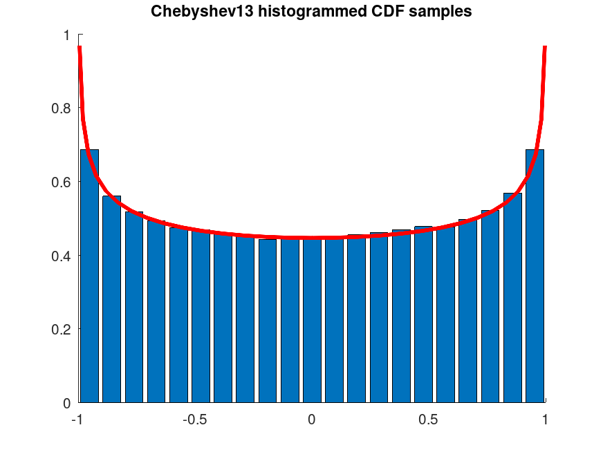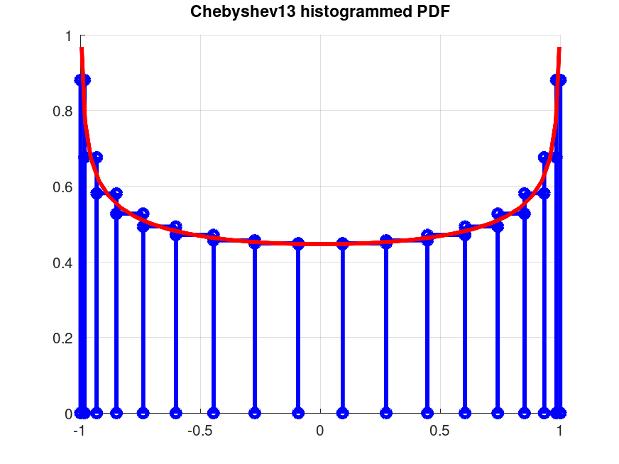 CHEBYSHEV13 is a test case for the PDF rho(x)=(1-x*x)^(-1/6) for x between -1 and +1, which is infinite at the endpoints. (In order to integrate to 1 over [-1,+1], multiply by the factor gamma(4/3)/sqrt(pi)/gamma(5.6).)