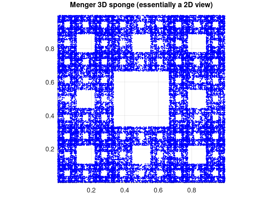 menger_sponge_chaos, an Octave code which applies a randomized linear map to a starting point to create a 3D dot-plot image of the Menger sponge.