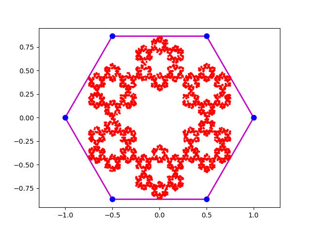 hexagon_chaos, a Python code which produces a fractal image inside a hexagon by repeatedly computing the barycenter of the triangle formed by the iteration point and a randomly chosen side of the hexagon.
