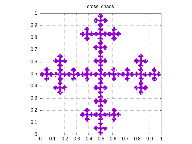 cross_chaos, a C++ code which applies a randomized linear map to a starting point to create a dot-plot image of a cross.