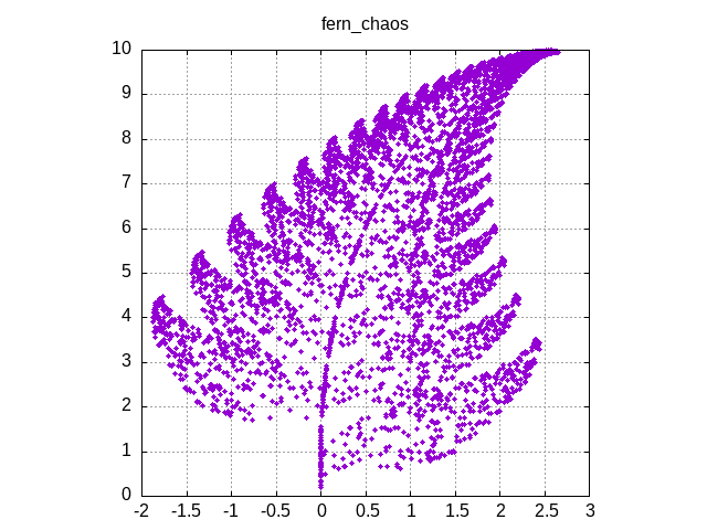 fern_chaos_test, a C++ code which calls fern_chaos(), which applies a randomized linear map to a starting point to create a dot-plot image of a fern.