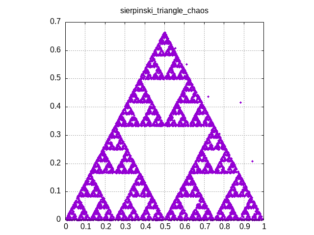 sierpinski_triangle_chaos, a C++ code which applies a randomized linear map to a starting point to create a dot-plot image of a Sierpinski triangle.