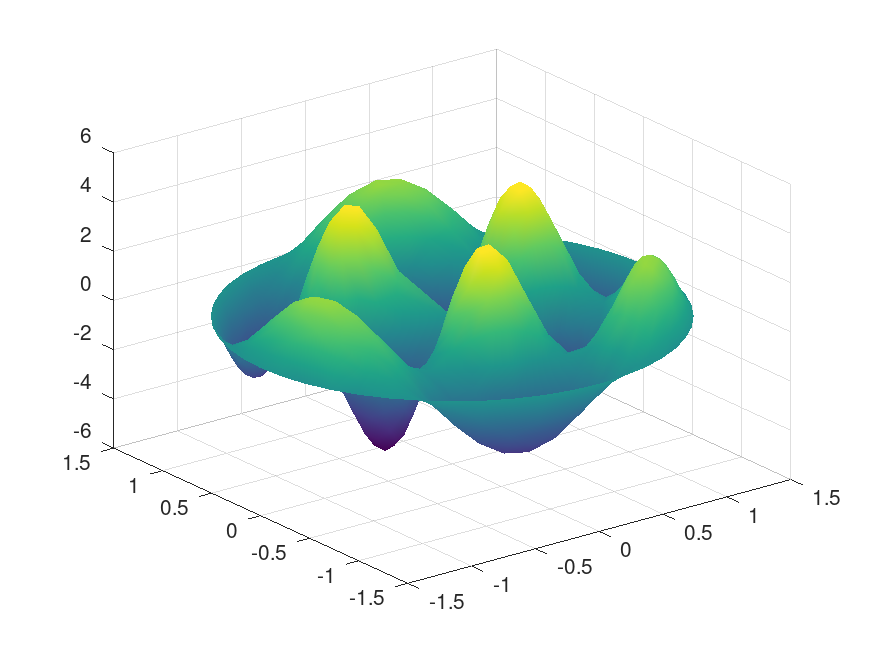 helmholtz_exact_test, an Octave code which calls helmholtz_exact(), which evaluates an exact formula for the solution of the Helmholtz equation, a sort of eigenvalue equation that can arise after separation of variables is a applied to the wave equation. This example considers a problem in which Z(x,y) represents the vertical deflection of the surface of a vibrating circular membrane such as a drumhead.