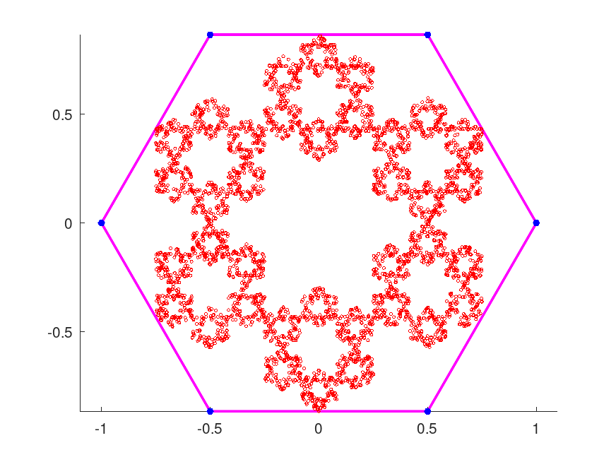 hexagon_chaos, an Octave code which produces a fractal image inside a hexagon by repeatedly computing the barycenter of the triangle formed by the iteration point and a randomly chosen side of the hexagon.