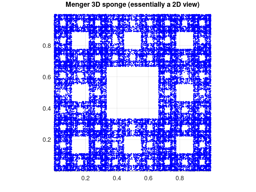 menger_sponge_chaos, an Octave code which applies a randomized linear map to a starting point to create a 3D dot-plot image of the Menger sponge.