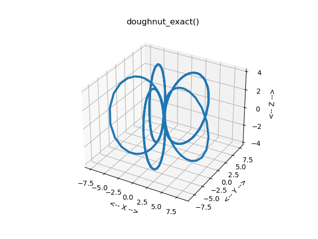 doughnut_exact, a Python code which evaluates an exact solution of a system of ordinary differential equations (ODE) whose trajectories lie on a torus or doughnut, and for which an exact solution is known.
